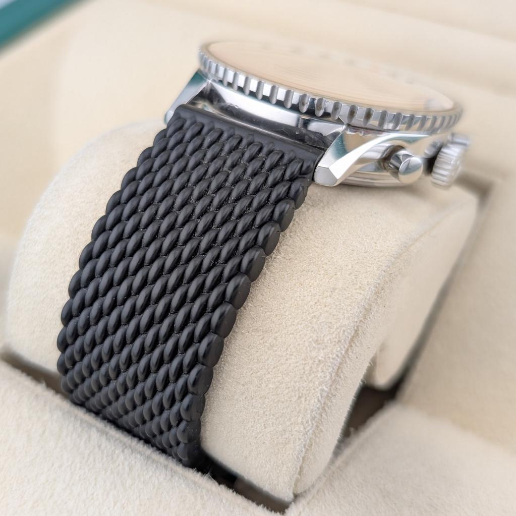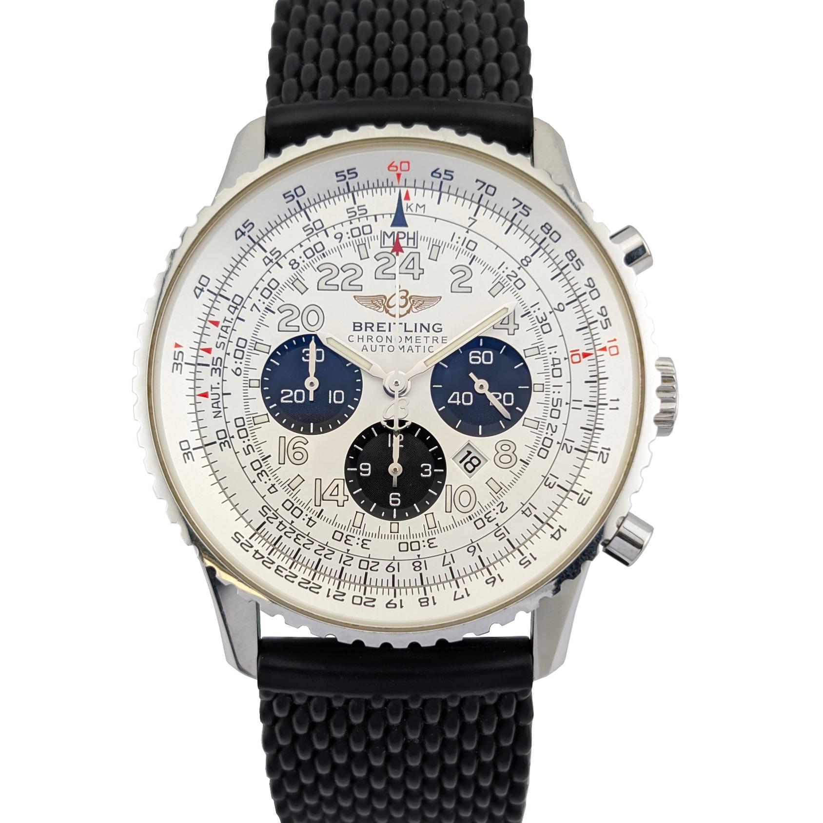 Model: Navitimer Cosmonaute 24hr Format – Stainless Steel on Breitling Black Textured Rubber Strap, Silver Panda Dial