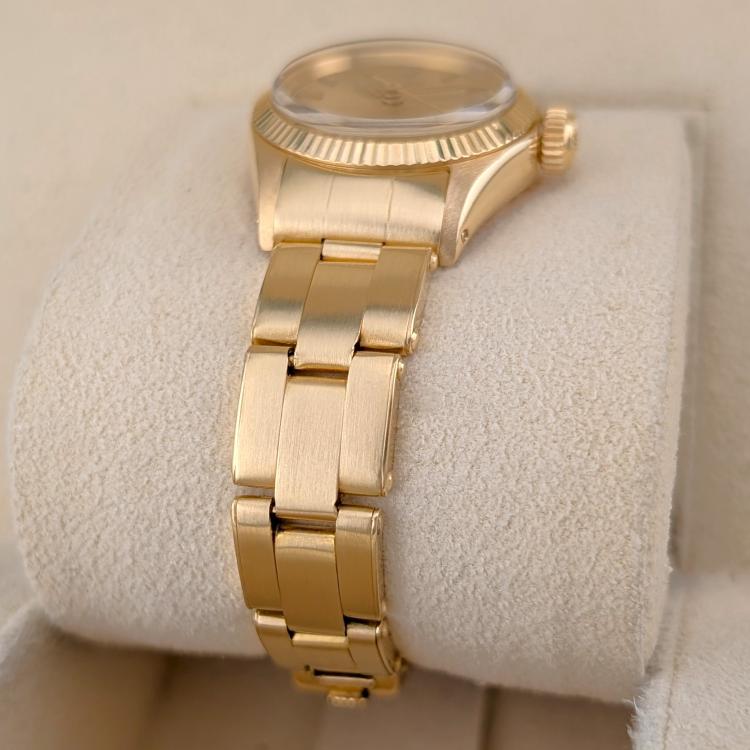 Model: Oyster Perpetual Lady – 18k Yellow Gold Case & Oyster Rivet Bracelet, Sunburst Champagne Index Dial